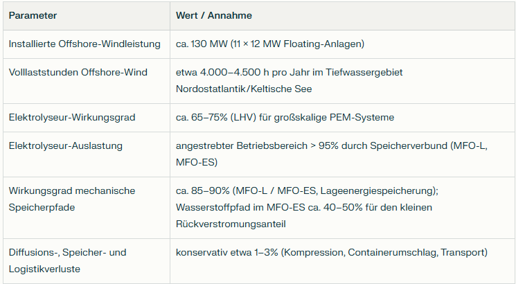 Daraus abgeleiteter Gesamtwirkungsgrad der Kette Wind → H₂ am Übergabepunkt (inkl. Elektrolyse, Kompression, Speicherpfade und Transportverluste): konservativ im Bereich von etwa 50–60%.